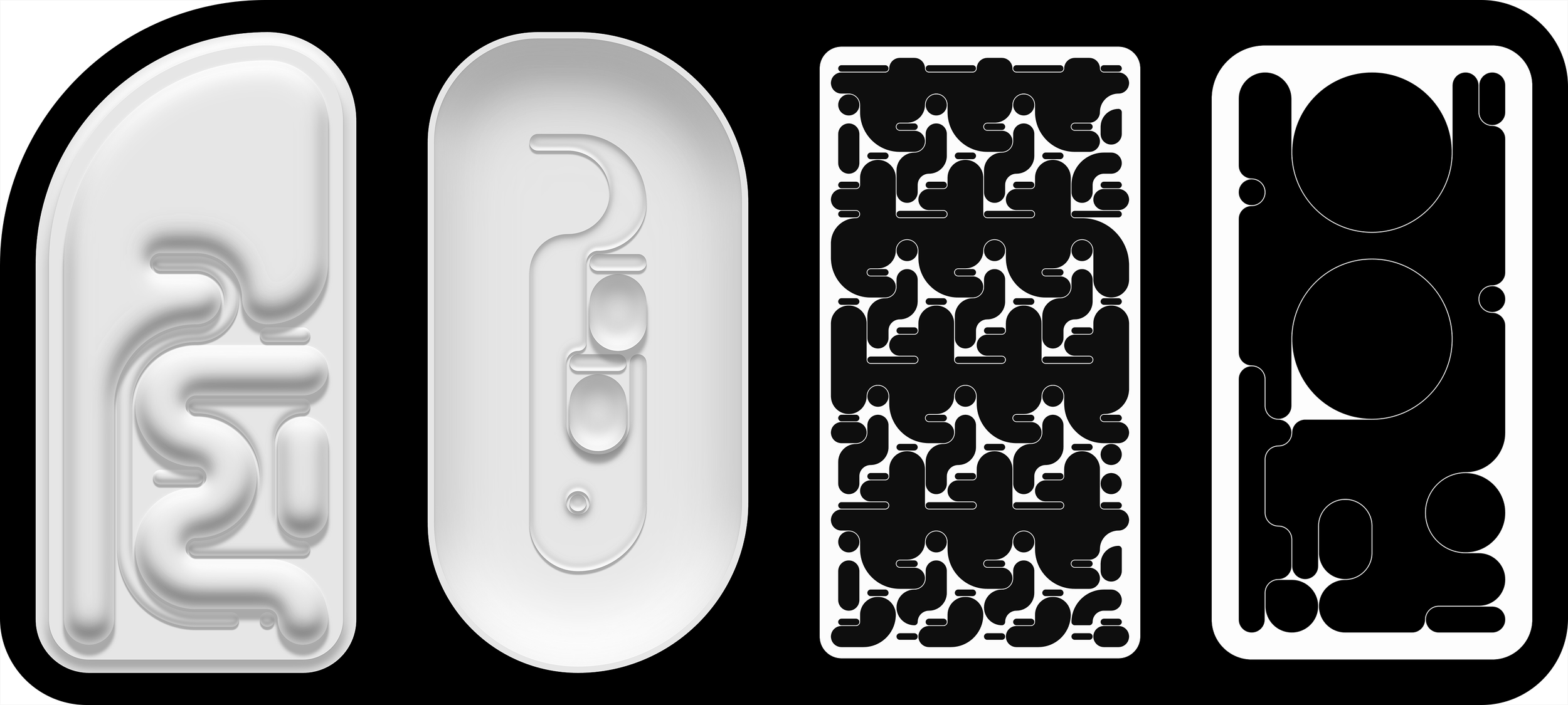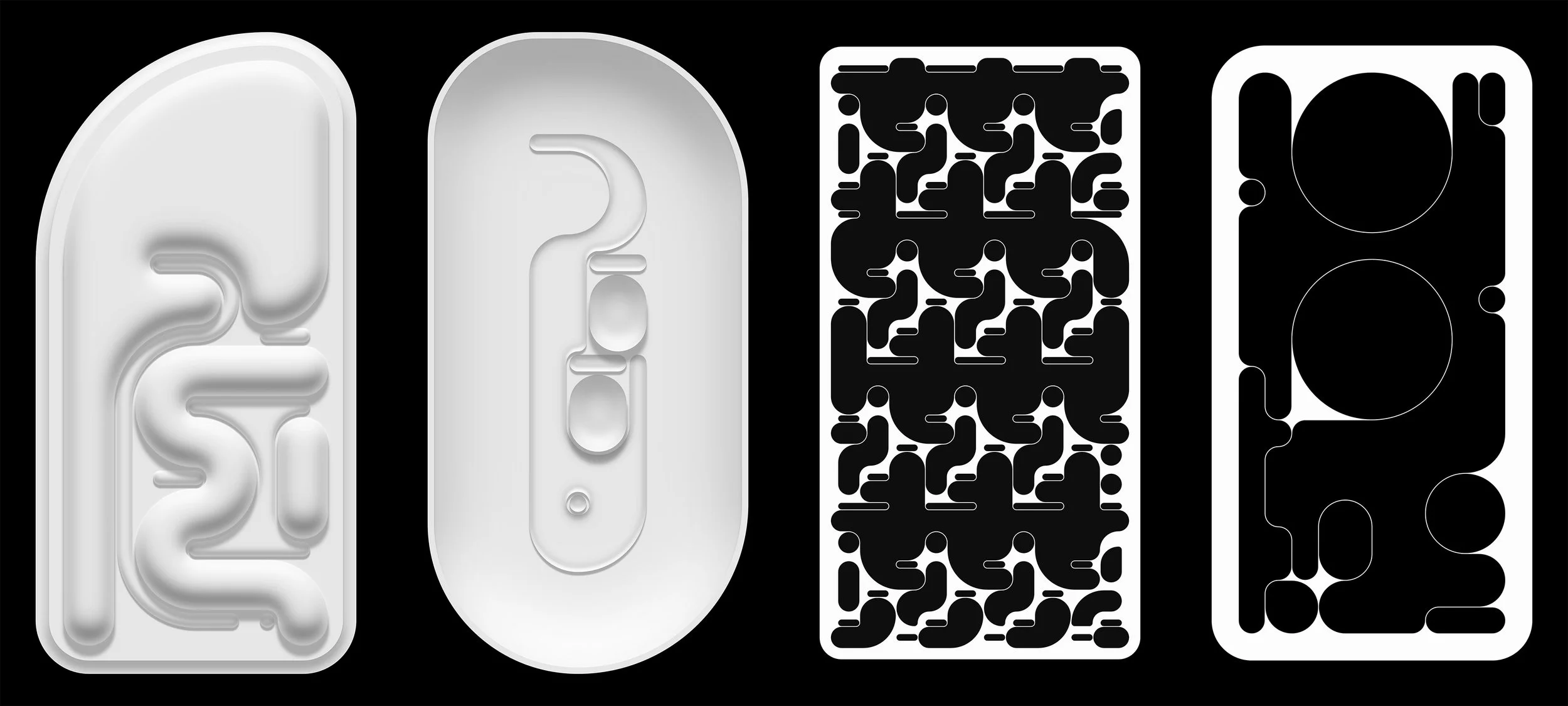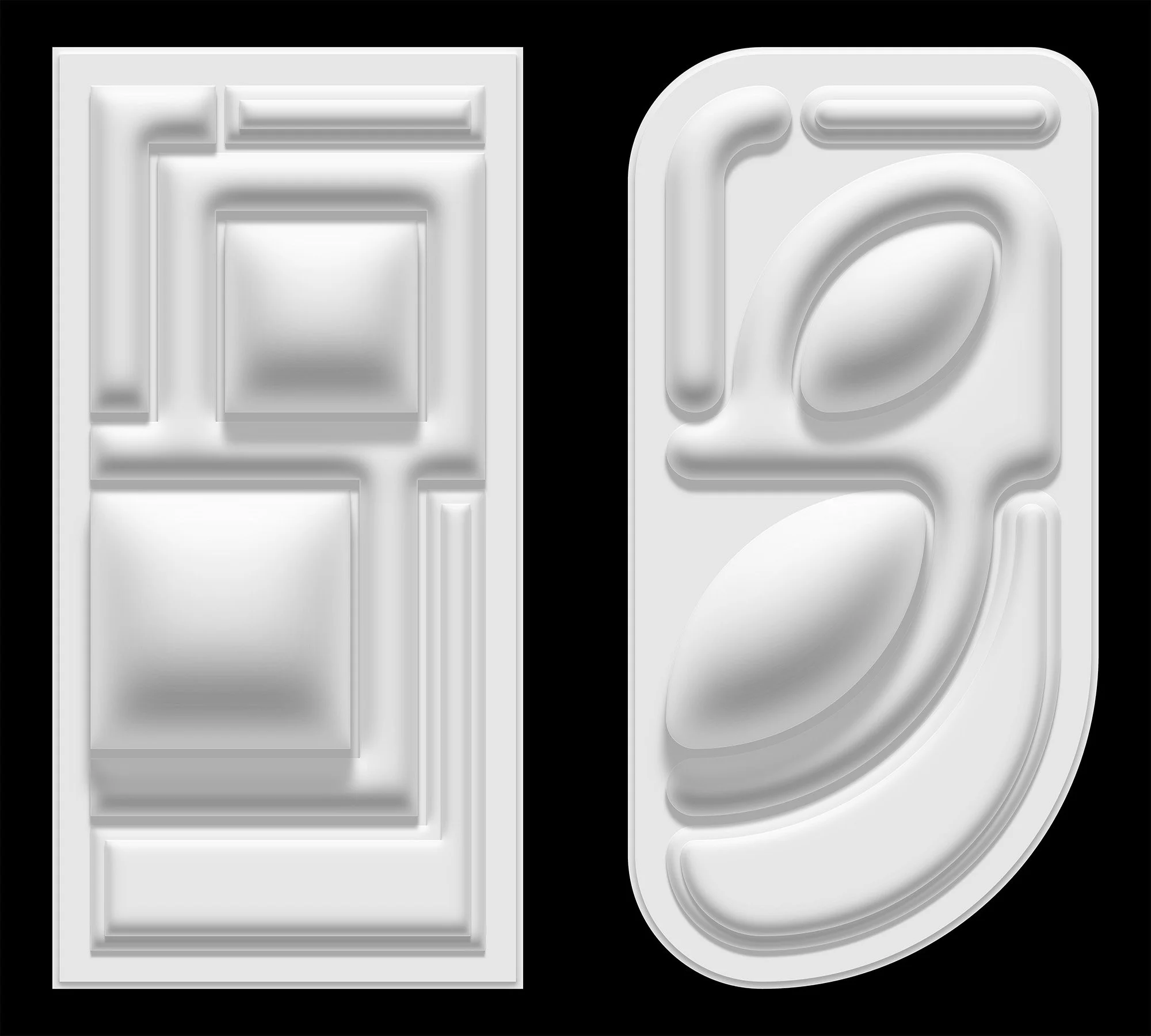 Although Prototypes is computational, it is guided by tactile intuition and perceptual bias. Depth and curvature are suggested through layered two-dimensional geometry rather than full volumetric simulation, producing image-objects that read convincingly as three-dimensional forms, while remaining sensitive to shifts in constraint that can introduce perceptual ambiguity. Outputs often resist a fixed sense of scale, reading alternately as interface elements, architectural fragments, or sculptural reliefs.