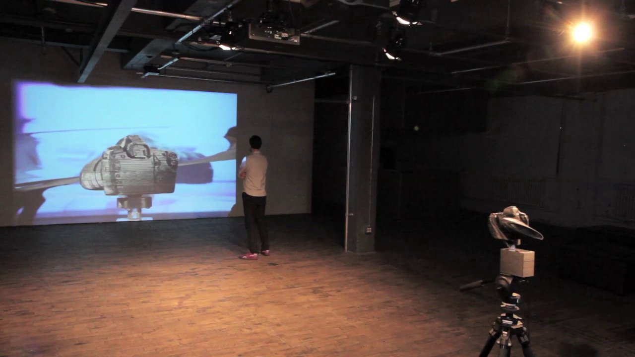 Squint is composed of a sculptural object; a replica of a familiar everyday object that has been distorted and twisted beyond recognition and into abstraction and that sits atop a stand, slowly rotating. A camera films the object in motion, sending a live video feed of its view to a computer. Just above the camera is what Parks calls a "transformative mirror"; a projected screen that shows a processed view of the live camera feed. In this virtual reflection of the space, the public that is present and circulating within the room are abstracted, while the sculptural object is de-abstracted and revealed in its original and recognizable form.