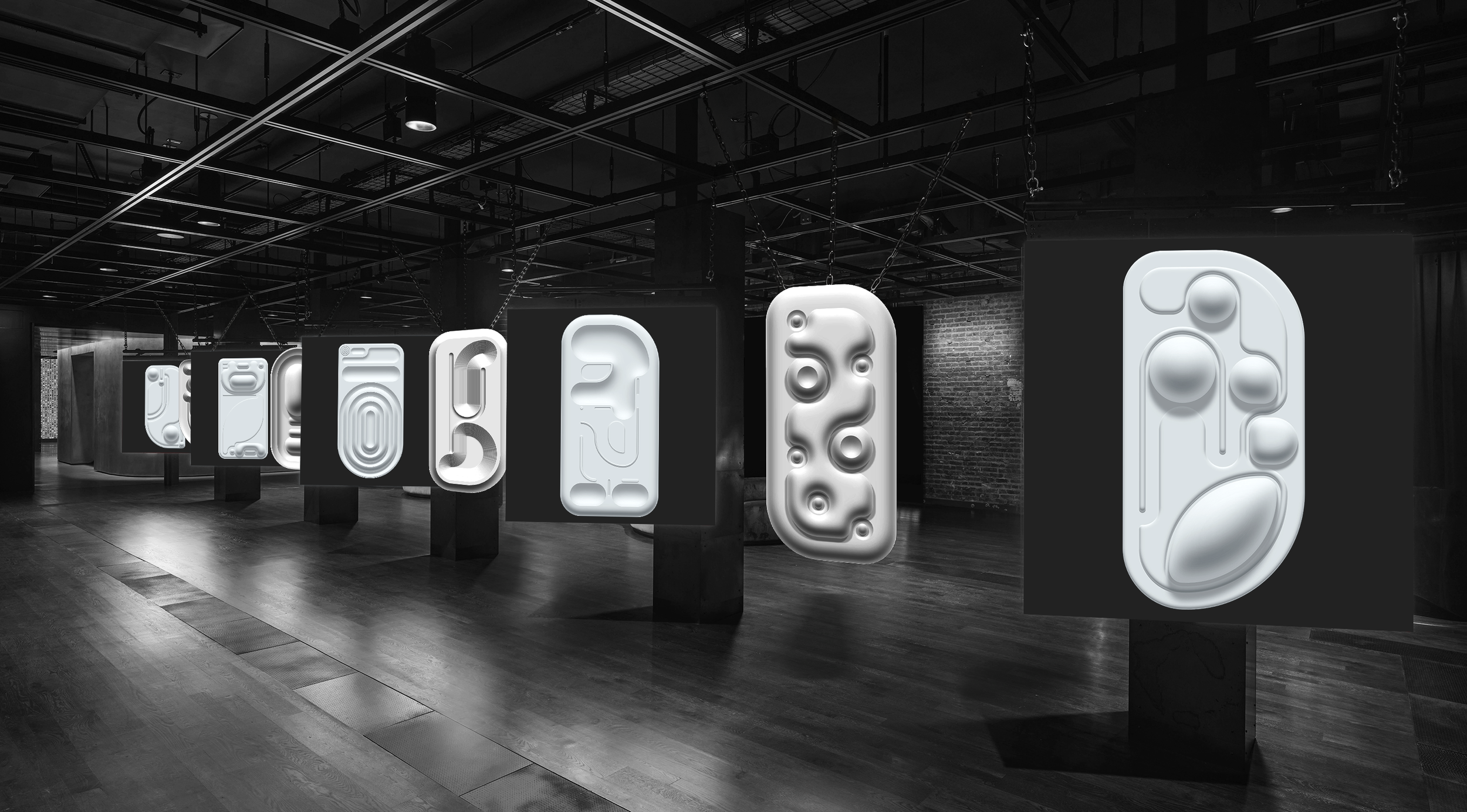 Within the Hanging Five corridor, CNC milled lightweight composite sculptures derived from selected system states would be suspended from the existing ceiling grid, occupying the intervals between the LED planes and scaled to match the apparent dimensions of the screen-based forms within the corridor. The result is a layered environment in which illumination slowly reveals fixed form in light while corresponding material volumes occupy the same spatial axis.